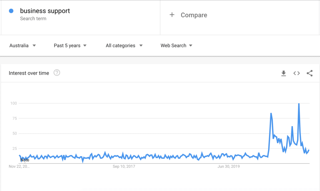 In March 2020, there was a spike in people Googling ‘business help’, ‘small business help Australia’, ‘business support’ and similar phrases. Even during the Global Financial Crisis of 2007/2008 these search phrases did not fluctuate. Australian businesses were in crisis mode.