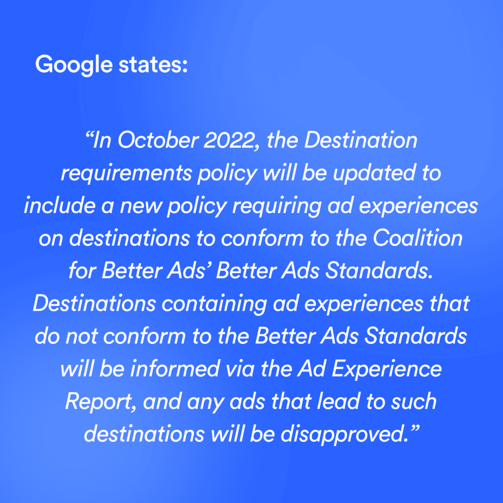 The Google Destination requirements policy update will require landing pages to meet the ‘Better Ads Standards’.