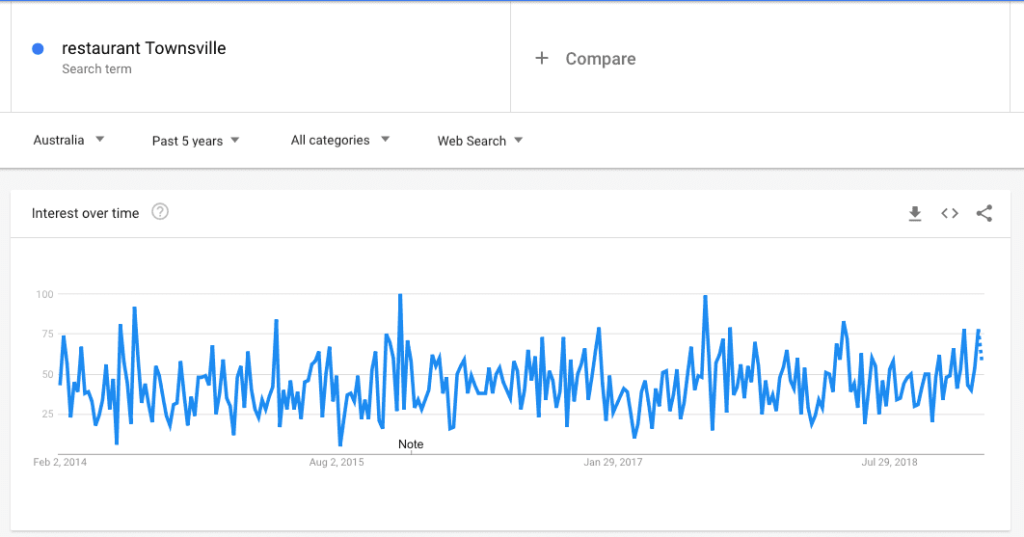 This is a key indicator that these are voice searches as it’s conversational. If we take a look at searches for restaurant Townsville over the same time period, the results are pretty consistent. It shows while voice search is on the rise, traditional search types can’t be forgotten either.