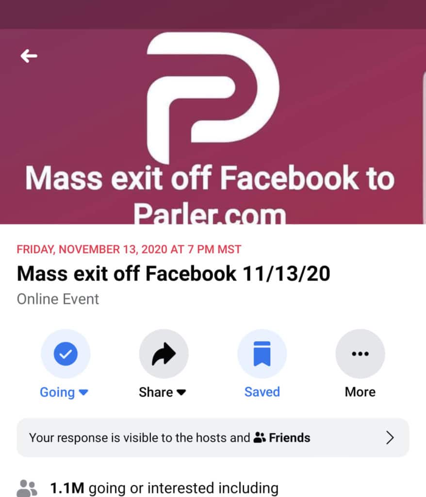 Right now on Facebook, there are numerous Mass Exit Off Facebook 11/13/2020 events, amounting to more than a million attendees. Many of the events, including what is believed to be one of the original groups, are being removed, while some grow in numbers by the minute. The online event would see people leave Facebook for self-proclaimed unbiased social media platform Parler at 6:00pm GMT-8 on the 13 November 2020.