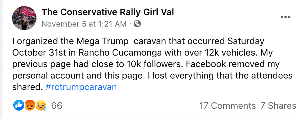 As of midday AEST, 9 November 2020, we were unable to locate The Conservative Rally Girl Val’s Facebook page or event.